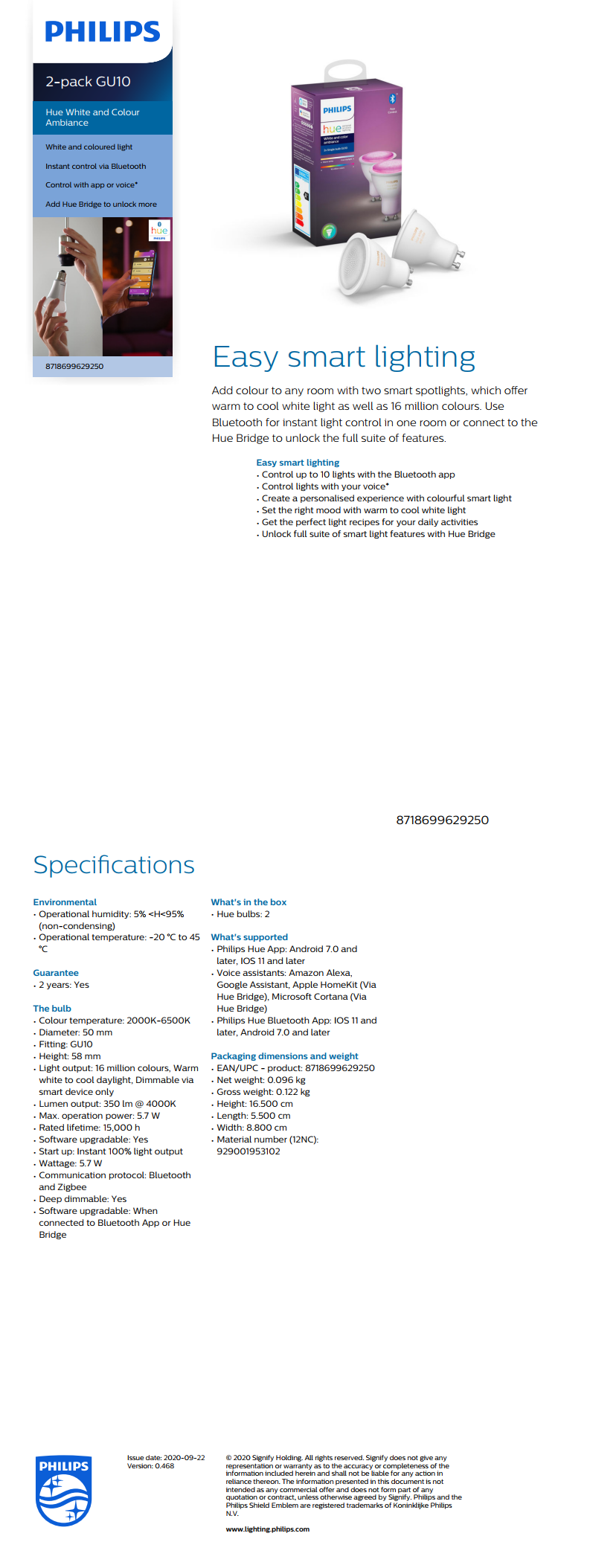 סט 2 נורות ספוט GU10 צבעוניות אלחוטיות חכמות תוצרת פיליפס, יצרנית התאורה הגדולה בעולם | הנורה נשלטת באופן מלא ע"י אפליקציה חינמית ל-iOS או אנדרואיד מהסמארטפון/טאבלט גם בחיבור Bluetooth | ניתן לשלוט בכ-50 נורות יחד בחיבור מגשר או בכ-10 נורות יחד באמצעות אפליקציית Hue Bluetooth | ניתן לקבוע את הצבע של הנורה מתוך ספקטרום מושלם של 16 מיליון צבעים וכל גווני האור הלבן וכן היא ניתנת לעמעום מלא מהאפליקציה.