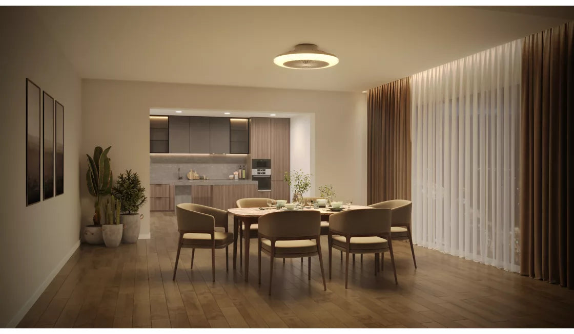 גוף התאורה מקיף את מנגנון המאוורר בצורה מעגלית, מה שמאפשר פיזור אור אחיד, רך ונעים בכל החדר — ללא צללים, ללא סנוור ועם נראות אסתטית ומרשימה. המבנה המעגלי מעניק מראה מודרני ויוקרתי ומשלב תאורה ואוורור באופן מושלם במוצר אחד.