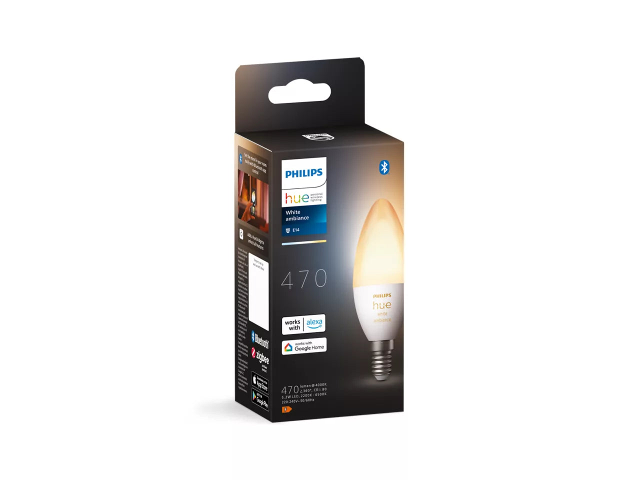 מפרט טכני: נורה חכמה בודדת בצורת נר. סוג תאורה White Ambiance – אור לבן מתכוונן. טווח טמפרטורת צבע 2200K–6500K. בית נורה E14. הספק כ-5.1W. עוצמת הארה כ-470 לומן. שליטה באמצעות אפליקציית Hue ו-Bluetooth. תמיכה ב-Hue Bridge לשליטה מתקדמת ואוטומציות. שליטה קולית תואמת Amazon Alexa, Google Assistant ו-Apple Siri. מיועדת לשימוש פנימי. חיסכון באנרגיה ואורך חיים ארוך במיוחד.